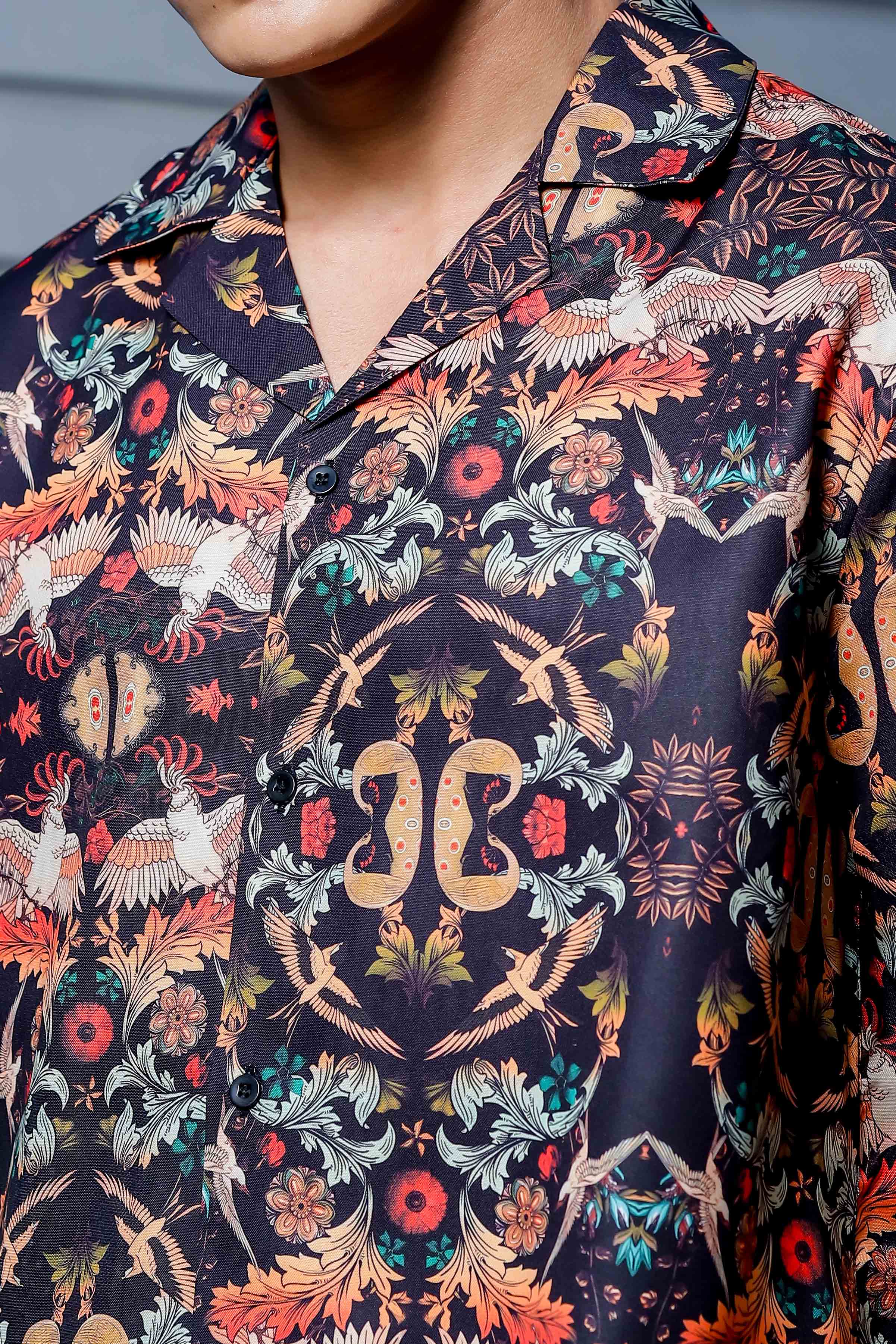 Black Relaxed Fit Floral Printed Cuban Collar Resort Shirt