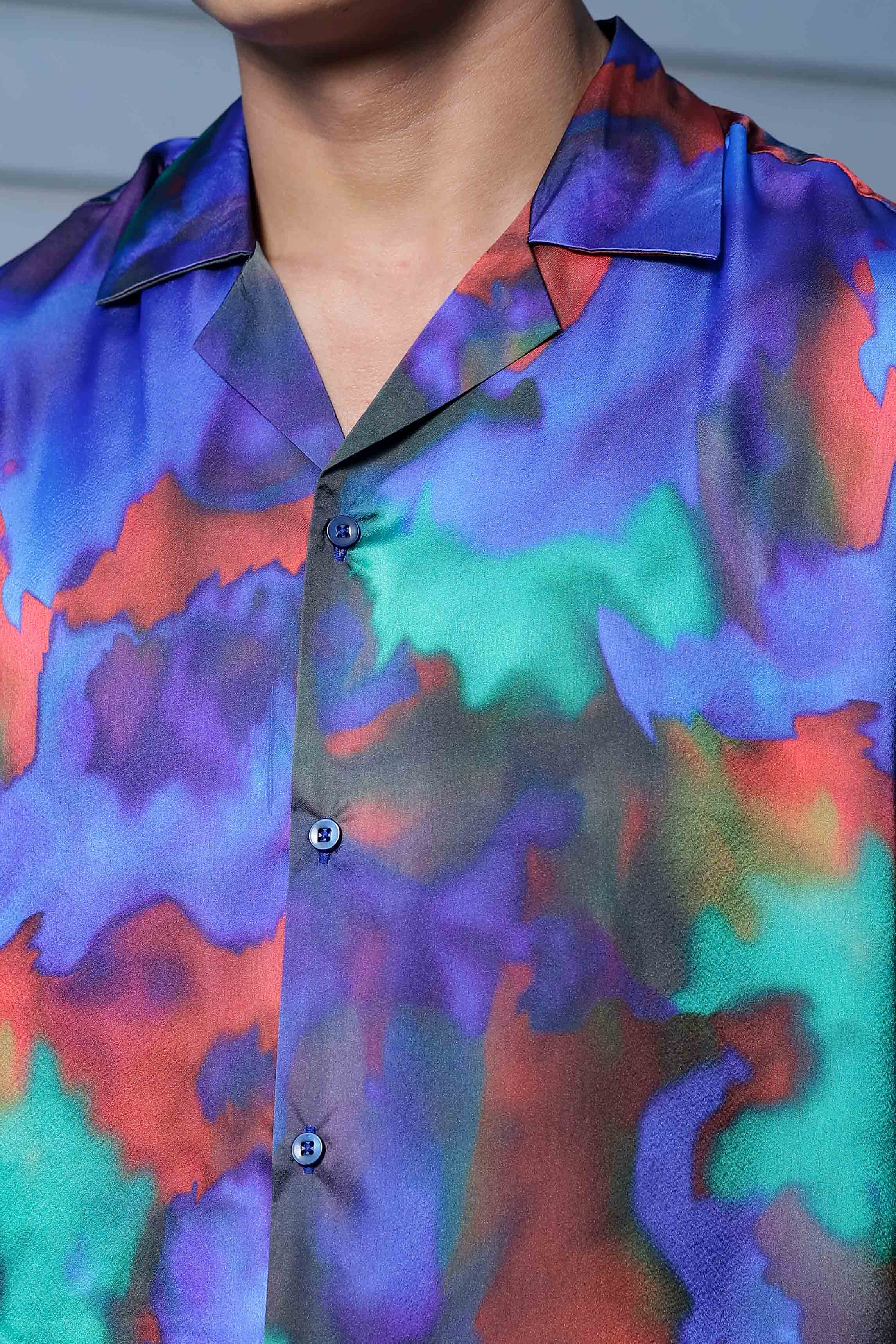 Blue Satin Abstract Print Cuban Collar Oversized Party Wear Shirt