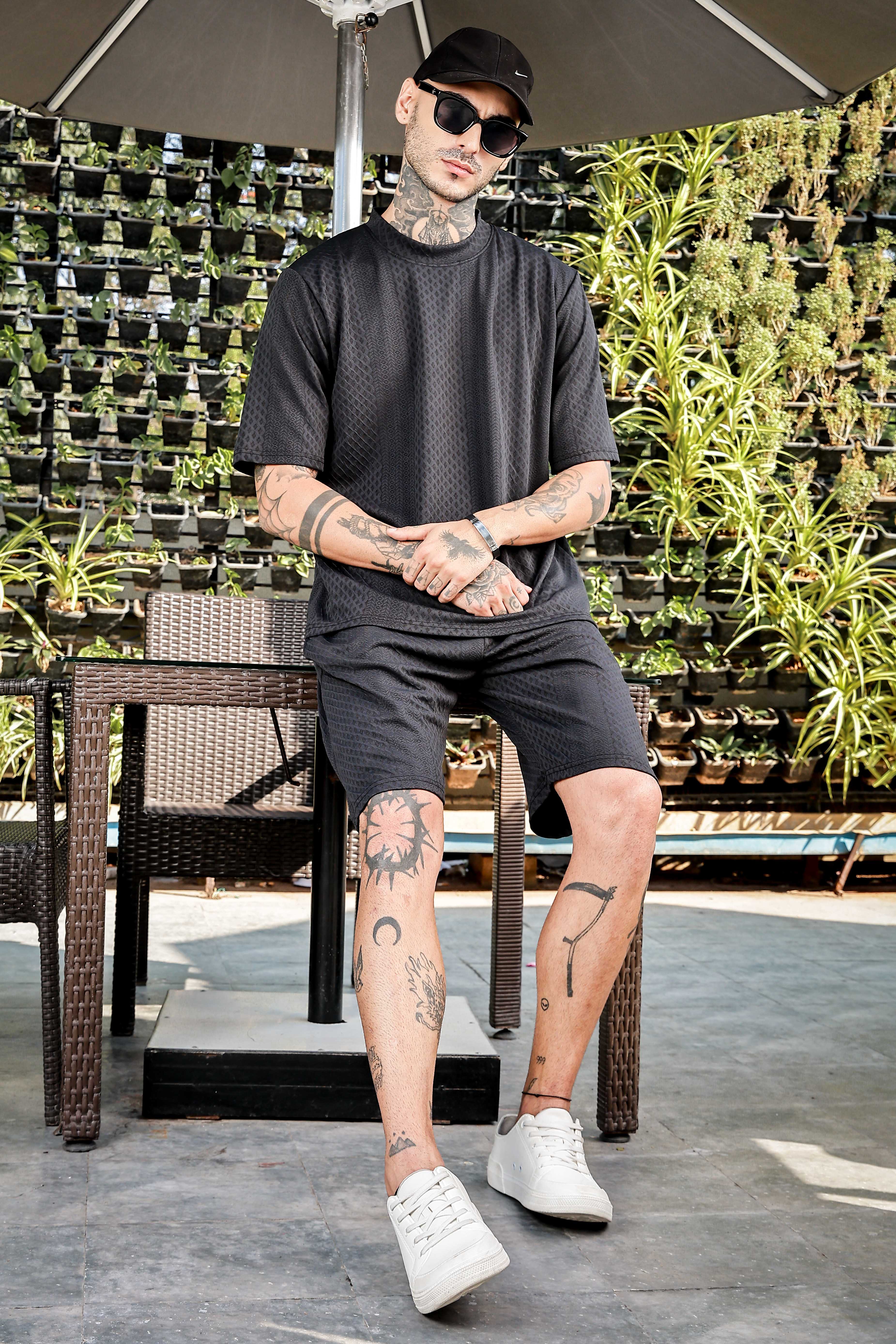 Black Textured Oversized Round Neck Tee & Shorts Co-ord Set