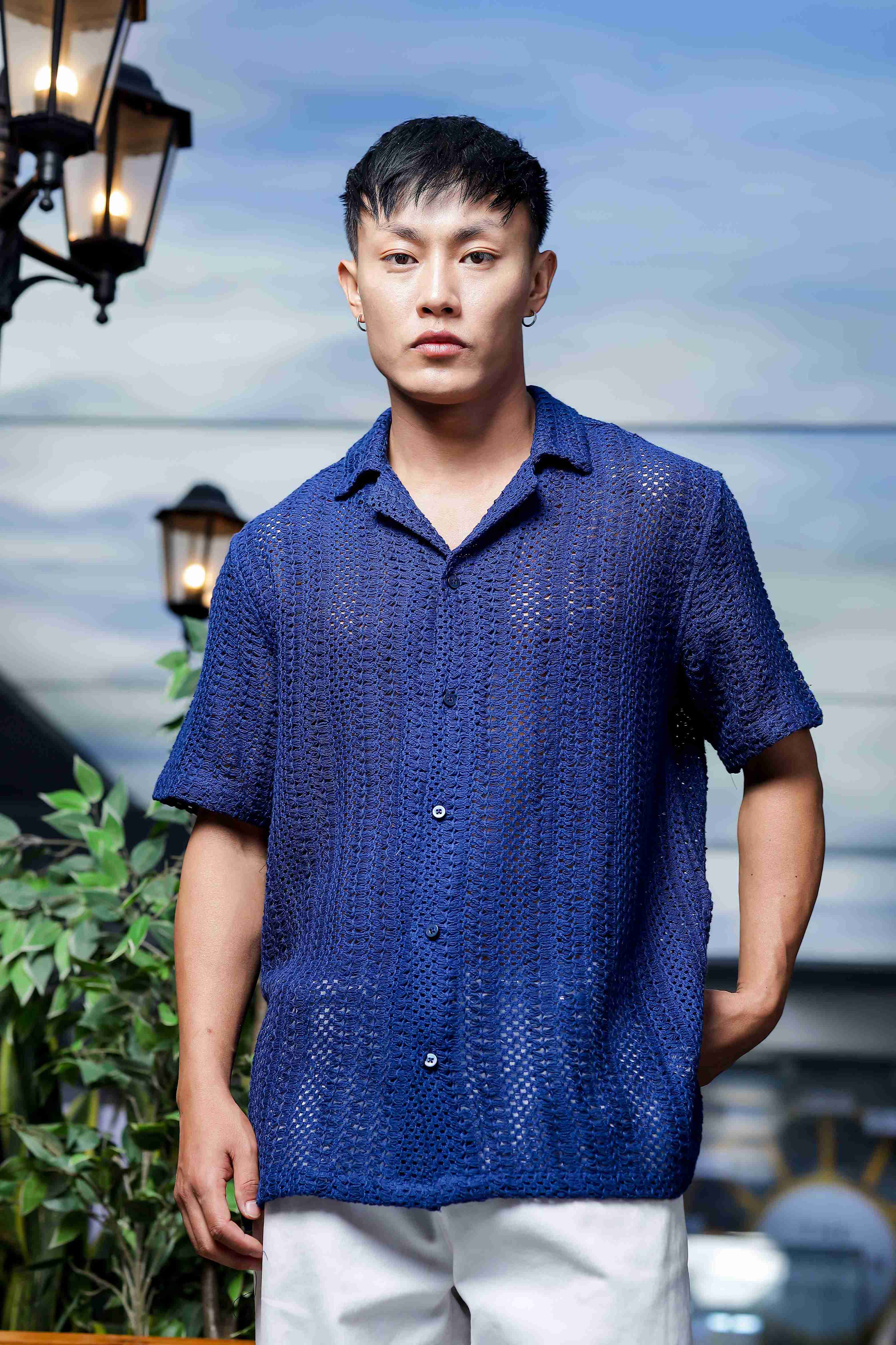 -70%Navy Blue Relaxed Fit Pure Cotton Crochet Resort Shirt—