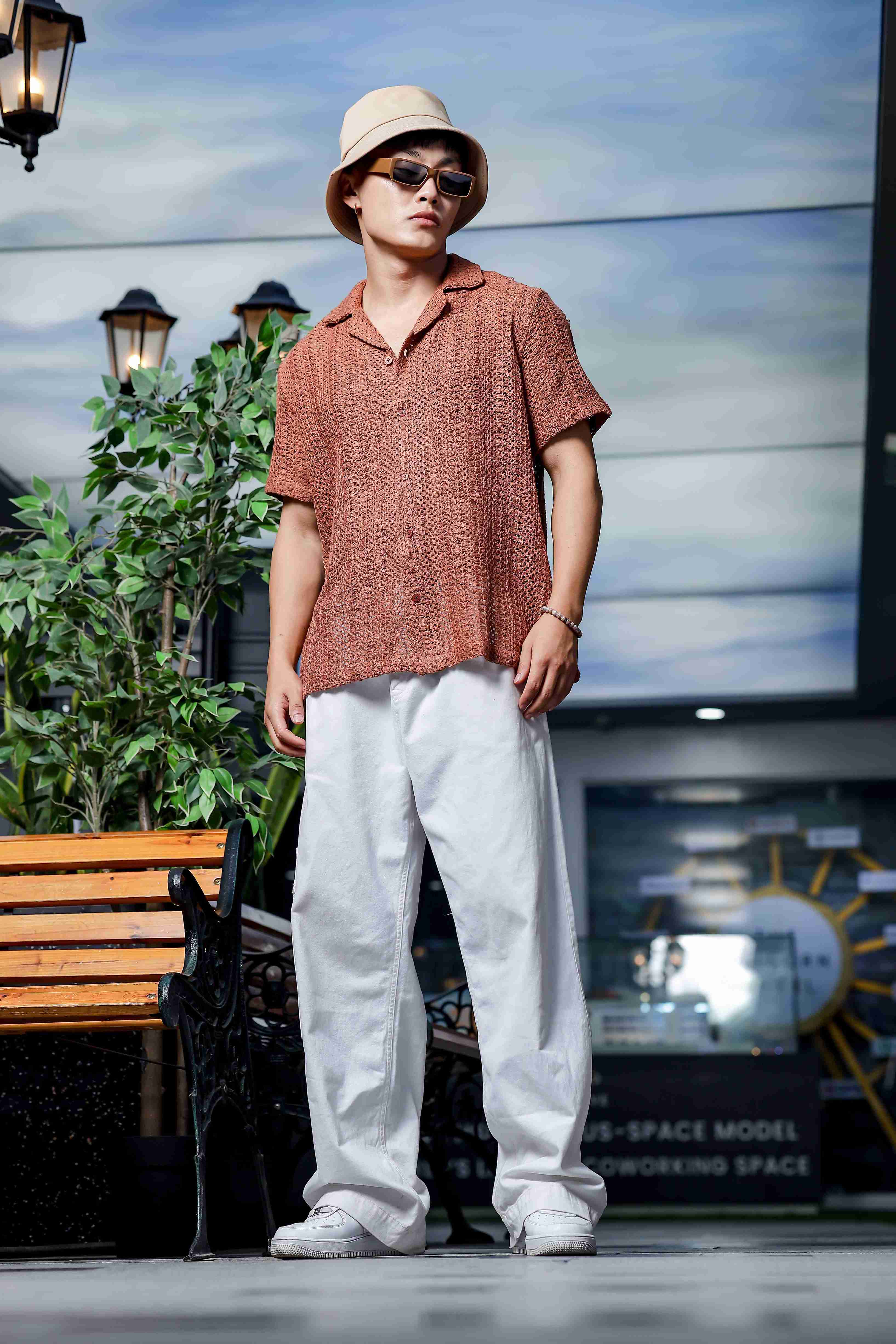 -70%Brown Pure Cotton Crochet Resort Shirt—