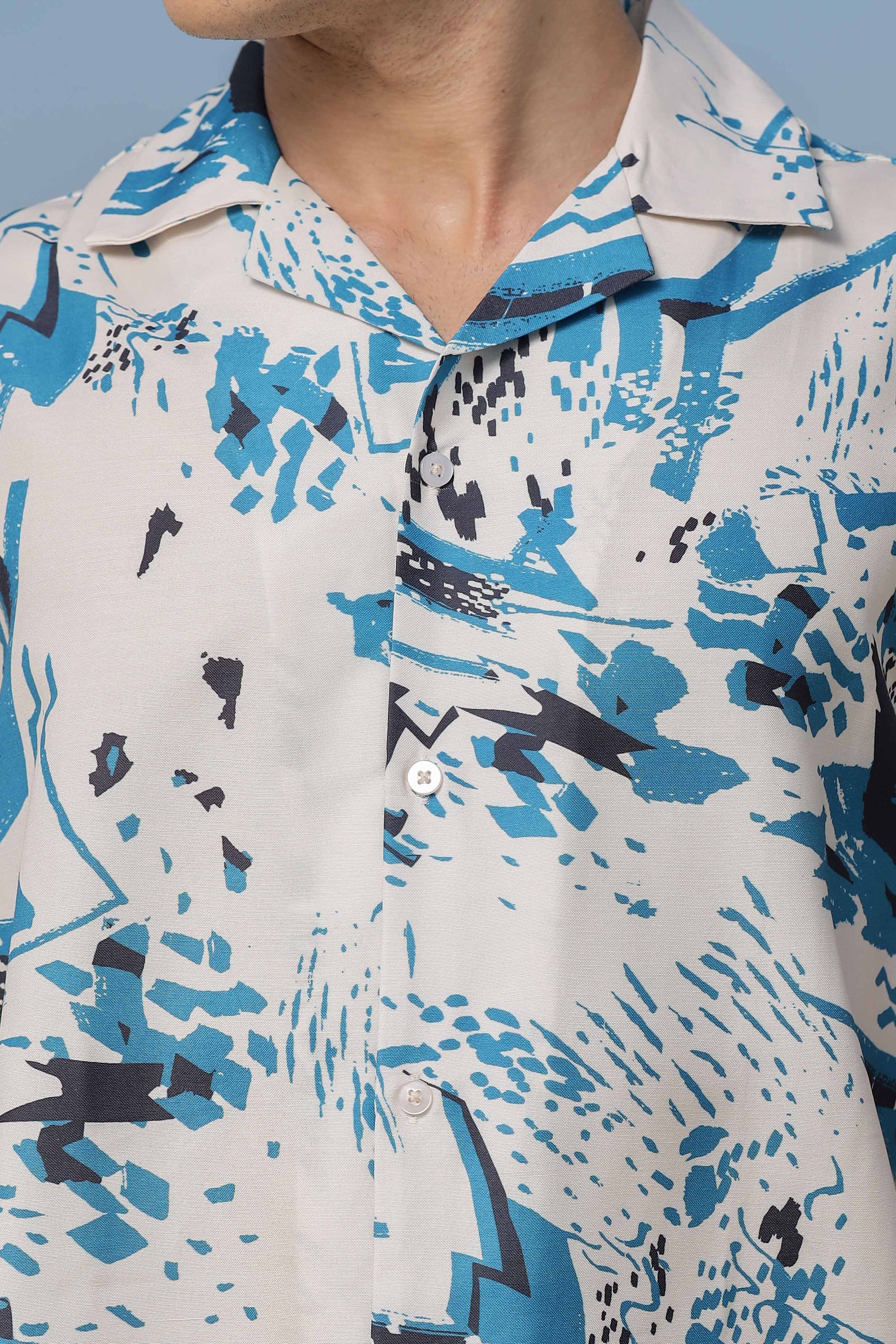 Off White Abstract Print Cuban Collar Relaxed Fit Resort Shirt