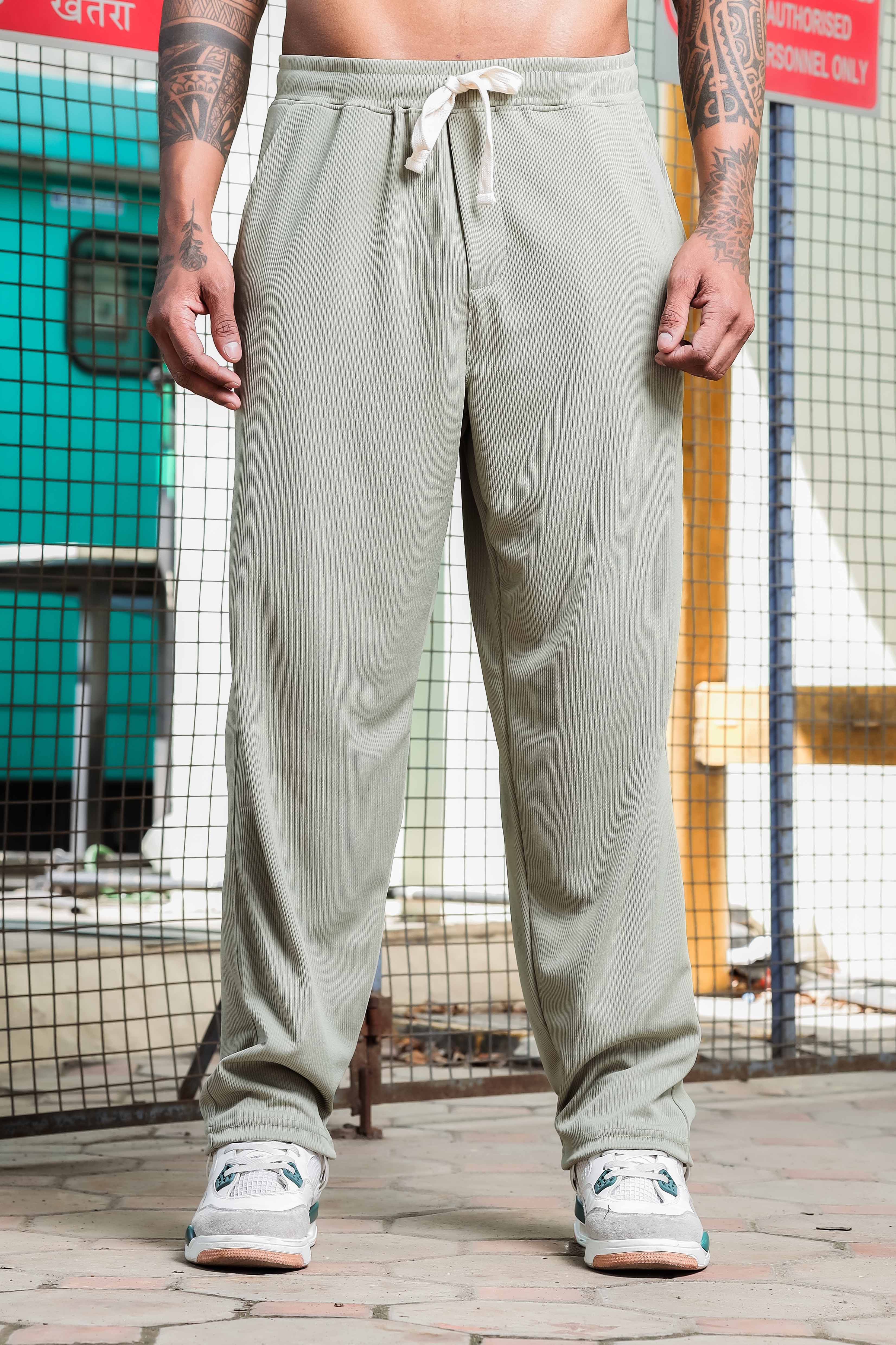 Olive Ribbed Relaxed-Fit Mid-Rise Track Pant