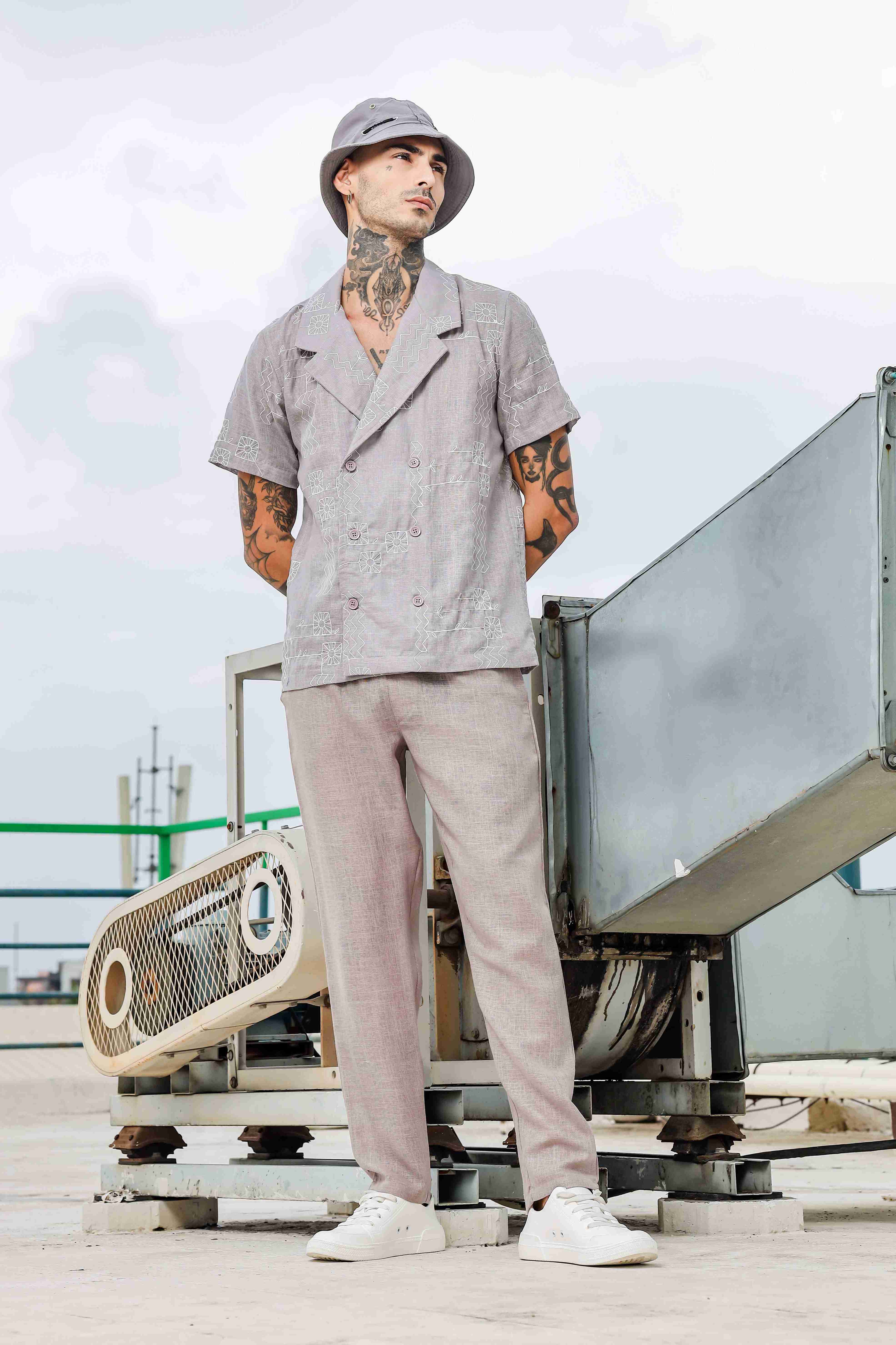 This must have coord set consists of a Relaxed half sleeve shirt with lounge pants.Relaxed-fit shirt in a patterned Linen Embroidered weave with a resort collar, Lapel front, short sleeves and a straight-cut hem. Beige Linen Embroidered mid-rise lounge pants, has an inner elasticated waistband with drawstring closure and two slant pockets on side and one pocket at the back