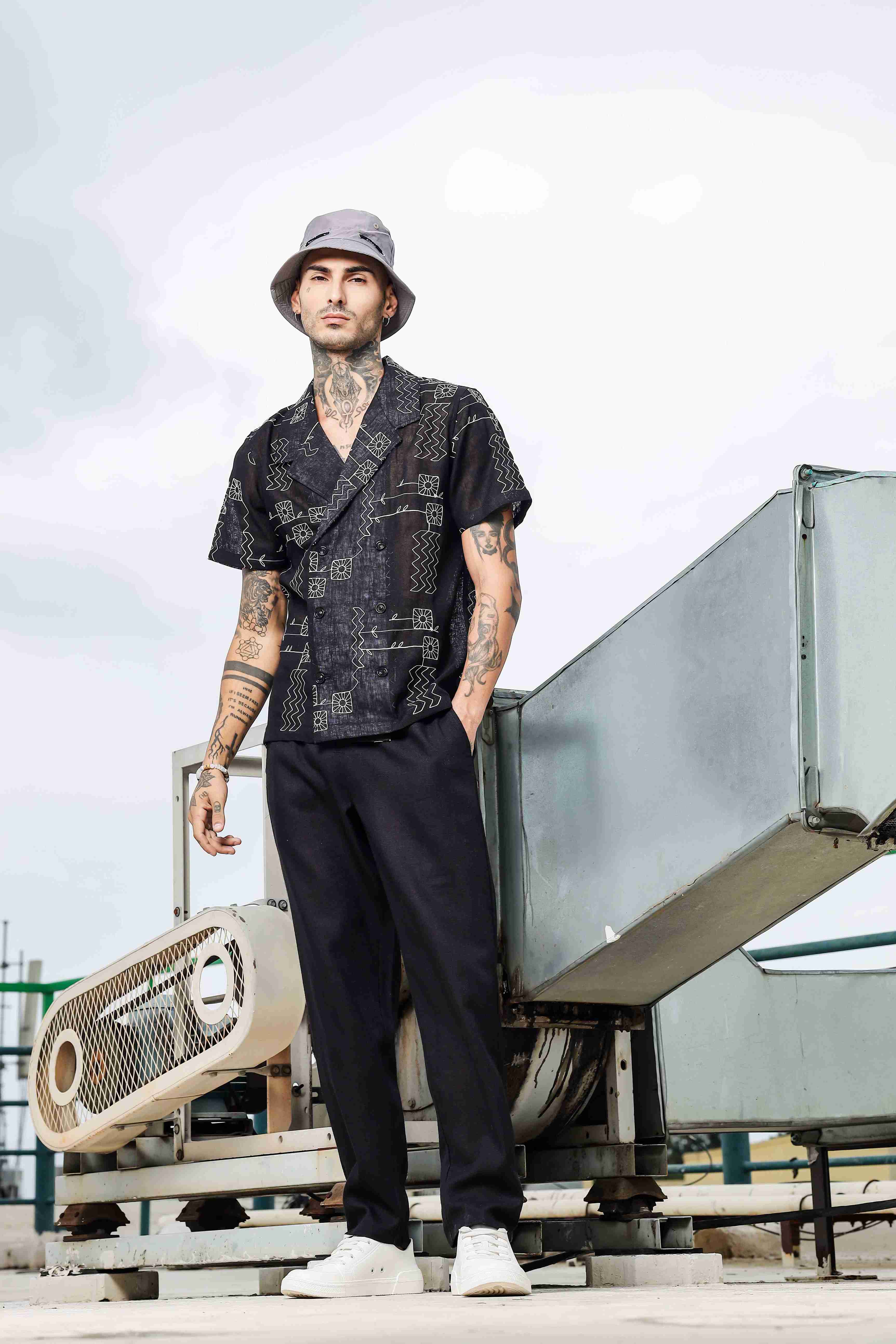 This must have coord set consists of a Relaxed half sleeve shirt with lounge pants.Relaxed-fit shirt in a patterned lLinen Embroidered weave with a resort collar, Lapel front, short sleeves and a straight-cut hem. Black Linen Embroidered mid-rise lounge pants, has an inner elasticated waistband with drawstring closure and two slant pockets on side and one pocket at the back