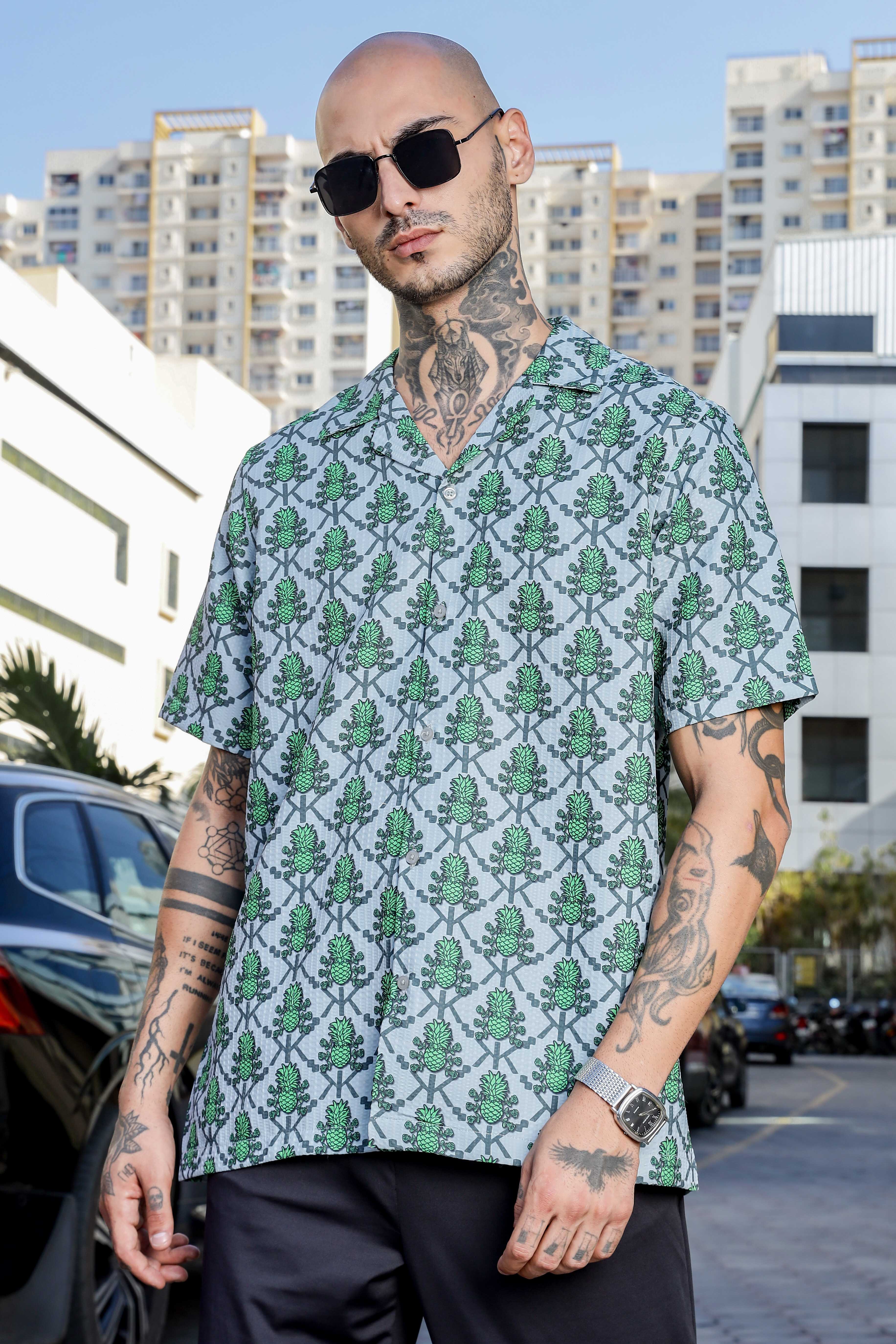 Green Tropical Print Textured Fabric Relaxed Fit Resort Shirt